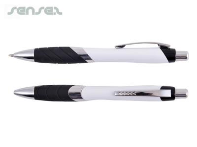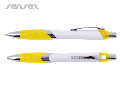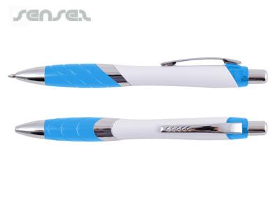 Promotional Tempo Pens are a click action ballpoint pen with a soft grip. These pens come with a silver barrel, white body and a choice of either translucent Light Blue, Yellow, Dark Blue, Green, Orange, Pink, Purple, Red or a solid black colour grip. Refill Colour: Black.
