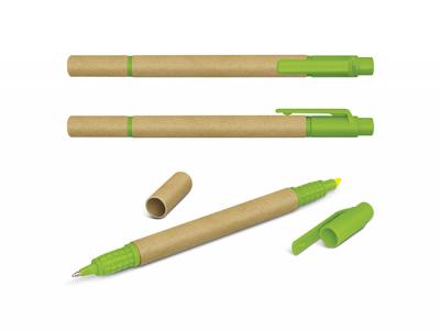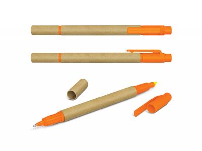 Specs: Environmentally friendly ball pen manufactured from recycled cardboard and cornstarch complete with a built in yellow highlighter. These Custom Eco Pens have a long lasting Blue ink refill and a quality carbide ball for improved writing.