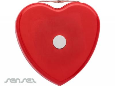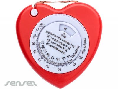 Plastic, 1.5 mt, heart shaped, BMI tape measure, with a white stop button, includes a weight (KG) and height (Mts.) indicator on the front. Perfect for fitness promos!