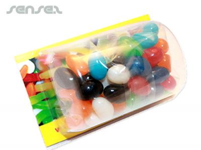Single coloured mini jelly beans in mixed colours with assorted Flavours. Plastic tub - fitting standard sized business cards & 30g bag of mini jelly bean. Perfect for any type of promo!