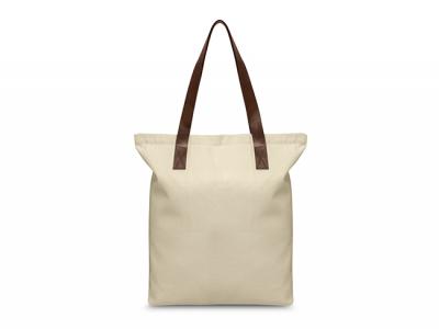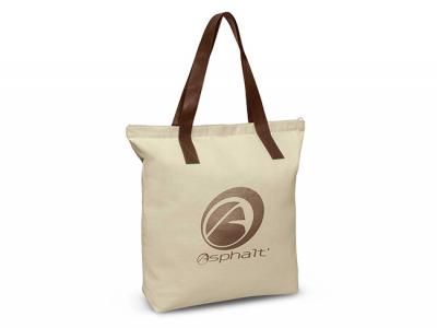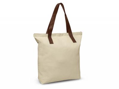 Custom Canvas Bags crafted from robust 280gsm natural heavy cotton canvas, featuring a zippered closure and stylish brown PU handles cross-stitched for durability. The ingenious base gusset maximizes functionality, allowing the carrier to make the most of these functional and stylish Custom Canvas Tote Bags.