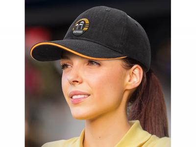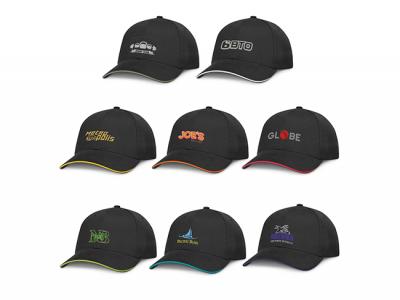 Personalise your black sports caps with colorful trim or custom design event hats for your marketing campaign.