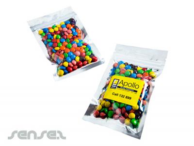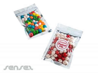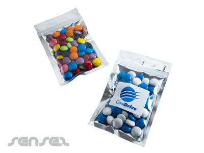 Promotional resealable Silver Zip Lock Bags Filled with your choice of lollies (50g). Printed with a custom full colour sticker, these silver bags will make a lasting statement with your customers. Great for weddings, fashion events or promotions.