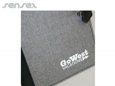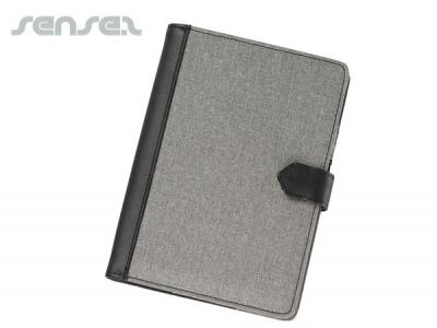 These custom branded small compendiums are made of grey Polyester and contrasted with black PU and Nylon materials, and come with many features: A replaceable 80 page ruled pad, a magnetic snap button closure and pockets for your business cards and a pen loop. Our A5 journals are the perfect tool to keep handy for all your notes!