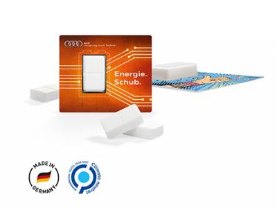 Our promotional cardboard cards come printed with your design and will boost your next marketing campaign with additional energy: The 3g glucose will give your clients an extra vitamin C kick (pharmacy quality) to come through the day! Use these universal promotional items to reach every target group and to be present at conferences, sports events, trade fairs and any other kinds of events and of course at a P.O.S. where customers could well do with some extra power. The concentrated power of this 3 g square of dextrose sugar, with vitamin C, is an inexpensive way to spread your promotional message!