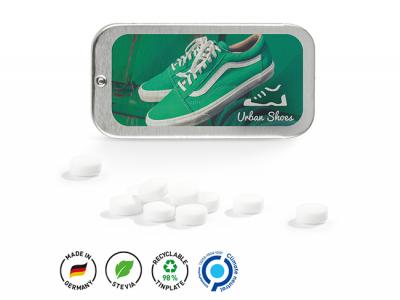 Small but impressive: Send refreshing messages with vegan peppermint Minties with Stevia. Thanks to the sliding lid with elegant doming that can be individually printed, the climate-neutral flat box provides a variety of application options, making it a perfect promotional article for a successful promotional message. A winning item made of 98% recyclable tin plate.