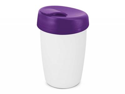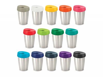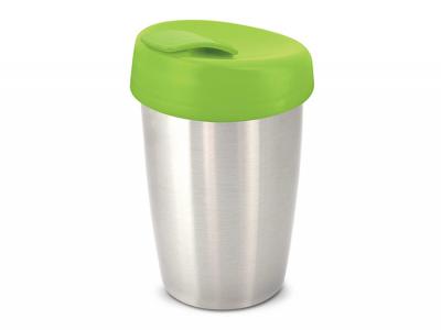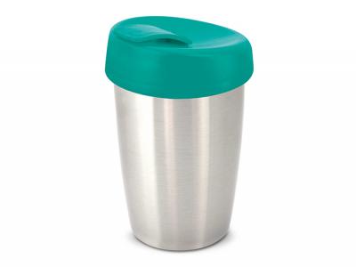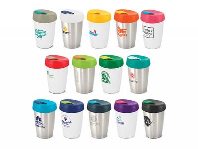 These promotional coffee cups have a stainless steel outer wall and the inner wall, lid and flip closure are manufactured from polypropylene. Both materials are BPA-free.