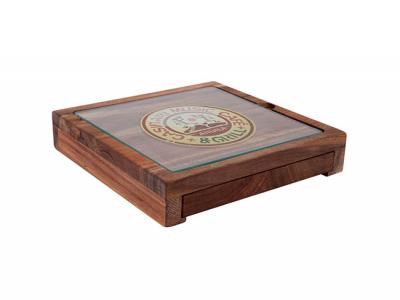 Chateau Acacia Cheese Box Sets are tempered glass cheese board inset into beautifully crafted acacia wood. A hidden drawer in the base conceals a 3 piece knife set. Acacia wood is known for its unique and natural contrasting patterns, no two units are identical. Presented in a premium book style gift package, this is the ultimate executive gift.