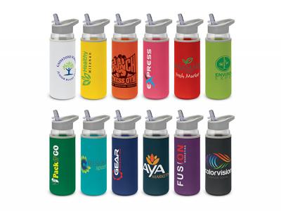 These promotional drink bottles are a desirable 700ml borosilicate glass drink bottle which have a soft, insulating neoprene sleeve that keeps drinks cool for longer. They have a secure screw on lid with a carry handle and a flip out drinking valve with a straw. Borosilicate is a lightweight glass that is exceptionally strong and shatter resistant. Glass is a natural choice for a clean, pure taste and it offers a safe and eco-friendly alternative.