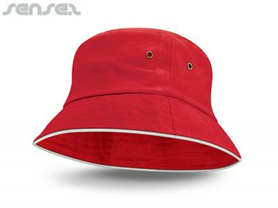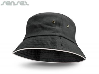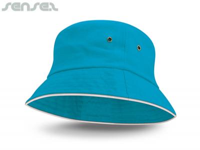 Personalised Bucket Hats are a premium heavy brushed cotton Embroidered Bucket Hat with stylish white sandwich trim around the base. custom bucket hats feature a sweat band and are available in three sizes Small, Med and Large. These are a smart bowling or school hat, a perfect addition to any uniform or sporting apparel. These Promotional Bucket Hats offer UPF50+ Protection from the sun and comply with ASNZS 4399-1996 standards.