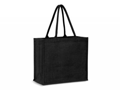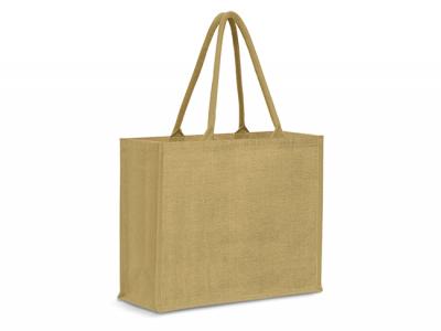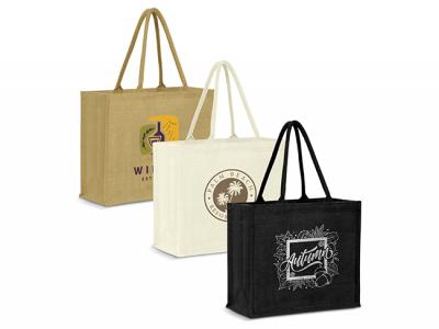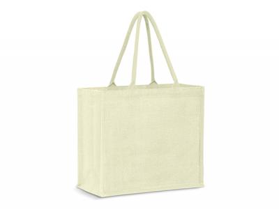 Custom Jute Bags are a medium sized laminated jute tote bag with a gusset and padded cotton handles. The bag and handles have been dyed to match.