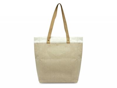 These natural laminated juco tote bags come with a gusset and decorative unbleached cotton trim around the top. They have a slip-in corrugated cardboard base and long woven carry handles which are attached with brass rivets for added strength.