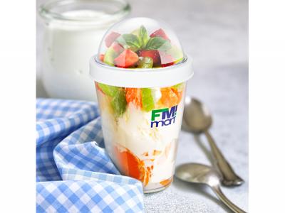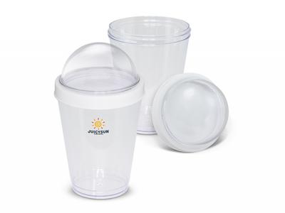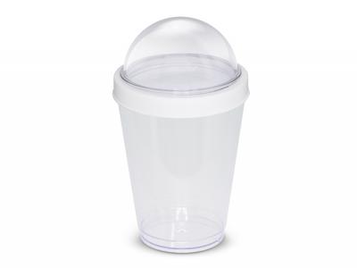 On The Go Cup Containers are a breakfast or lunch on the go salad or lunch container. This convenient 300ml BPA free reusable cup has a separate domed compartment to store fruit, muesli and dry ingredients. The cup and domed compartment are manufactured from clear AS material and it has a secure screw on polypropylene lid. Handwashing is recommended.
