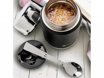 Explore Swiss Peak Vacuum Container is a premium 500ml double wall, vacuum insulated stainless steel food flask. It has a unique copper lining on the inner wall which improves its performance and the outer wall has a tough powder coated finish. Explore will keep food hot for up to 12 hours and cold for up to 24 hours. It has a screw on serving bowl and a foldable stainless steel spoon which snaps securely into the lid. This precision vacuum flask is BPA free and laser engraves to a shiny steel finish. It is presented in a Swiss Peak gift box with an information leaflet included. Handwashing is recommended. This is the ultimate Travel or Outdoor companion.