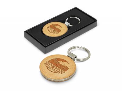 These custom Wooden Keychains are a round natural beech wood keyring with decorative metal trim. It laser engraves to a natural etch and is beautifully presented in a black gift box. Wood is a natural material which produces unavoidable variances in the grain pattern, colour and branding. These are a natural stylish branded gift idea.