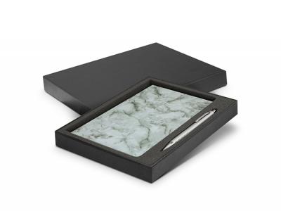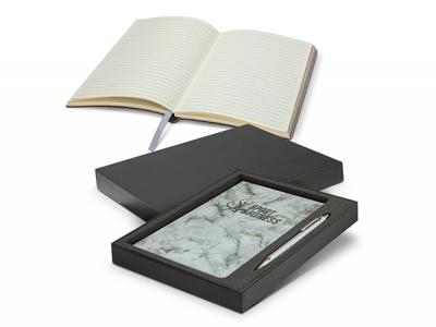De Vinci Notebook And Pen Sets are a vibrant gift set which is presented in a smart black gift box. It includes a medium size De Vinci Marble Soft Cover Notebook and a retractable aluminium SoHo Silver ball pen. The notebook has a flexible thermal PU cover with a delightful marble patterned soft touch finish. The thermal PU is manufactured for debossing and the notebook debosses to a charcoal colour. De Vinci Marble Notebook has 80 leaves (160 pages) of lined cream paper and a book mark ribbon. The pen has a debossed pattern on the grip, a matt lacquered barrel and shiny chrome accents. SoHo Pen has a large 800 metres of blue writing ink. SoHo Pen laser engraves to an oxidised white colour.
