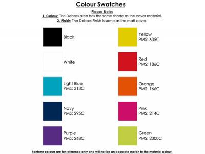 - Matt PU Hard Cover, Debossed on front cover (full A5 area available for debasing) included in the price.