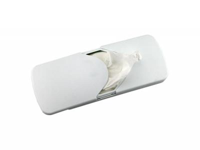 Car Visor Antibacterial Tissue Packs are a pack of 30 anti bacteria non woven dry tissue in a sliding open plastic container. With a steel wire hook on the back, it can be Installed onto any car sun visor, so convenient and easy to fetch the dry tissue while your are driving. The box can be refilled when it is empty.