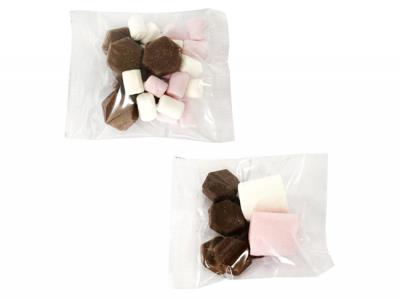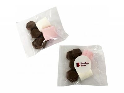 These sweet little bags come with a mix of 6x melting Lindt Milk Couverture Chocolates (approx 23g) with 2x Marshmallows (approx 8g). These are fantastic as a lovely promotional item.
