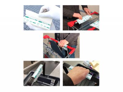 The pictures shown demonstrate the application of the sheets in store and an example of artwork/branding. When the customer has finished shopping the paper can be easily removed from the trolley or basket and disposed of in the paper recycling bin.