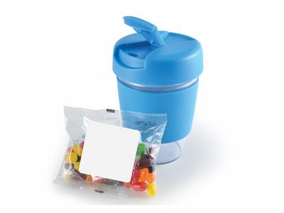 A freshly brewed coffee and yummy jelly beans: What a nice way to start the day! And these promotional sets printed with your logo combine both: A 320ml clear reusable coffee cup with heat resistant silicone sleeve and screw on lid as well as a 50 grams bag of colourful jelly beans.