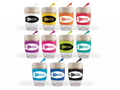 Personalise your eco flip lid glass coffee cups with silicone bands (320ml) or custom design glass travel cups for your marketing campaign.