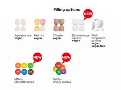 Content: Micro sweets, 25g; Skittles chewy candies, 25g; Pfeffi sugar-free peppermint pastilles, 12g; dextrose sugar squares with raspberry flavour, 20g or MM`s chocolate drops, 25g