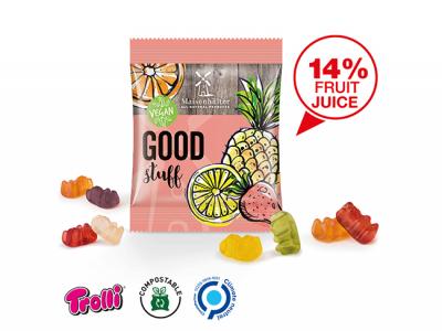 Vegan snacks are right on trend! Vegan jelly bears allow you to address a consciously-consuming target group and to advertise effectively. The climate-neutral mini bag in white or transparent, optionally compostable foil that can be individually printed provides enough space for your customised design and strong promotional messages. Use vegan power!