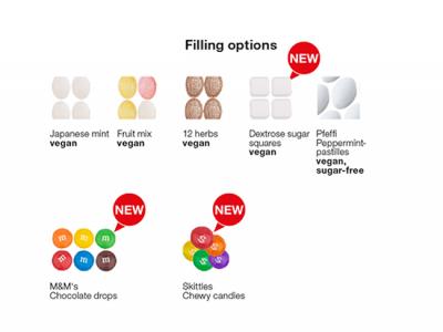 Content: Micro sweets, 13g; Pfeffi sugar-free peppermint pastilles, 12g or dextrose sugar squares with raspberry flavour, 14g - With surcharge: Skittles chewy candies, 18g or MMs chocolate drops, 15g