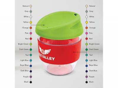 This Tritan option of our Marx Coffee Cups is a sophisticated 230ml coffee cup with a secure push on silicone lid and a wide heat resistant silicone band. These cups are manufactured from crystal clear Tritan which is a premium material that is BPA-free, shatterproof and odour-resistant. The lid and band can be mixed and matched in any colour combination from the standard colours at no extra cost. Up to five different colour combinations are included in the price and more are available for an additional charge.