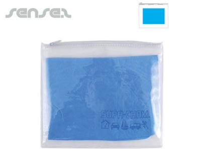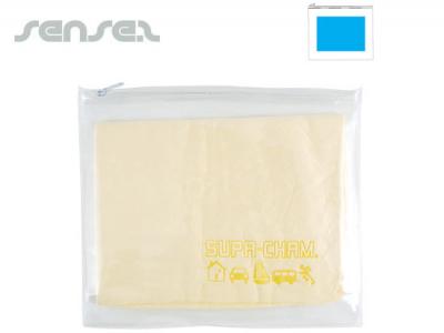 Promotional Chamois have your logo printed on them and are packed in a polybag. Synthetic pre wet body towel/chamois with rounded corners in cello bag packaged in clear PVC pouch. Chamois supplied with "Supa Cham" embossed logo as standard. Your logo is screen printed or full colour sticker printed onto the pouch - Not Chamois.