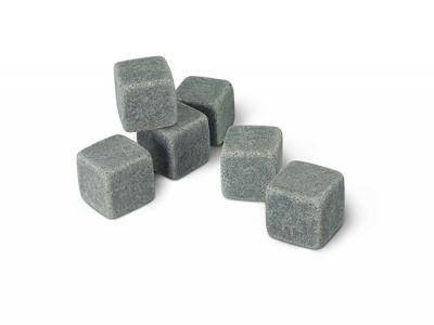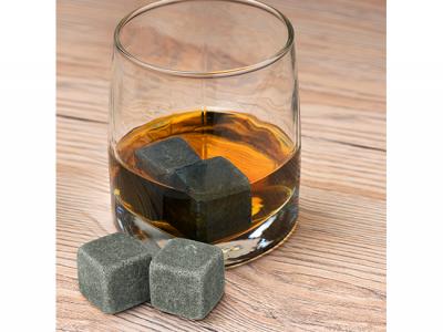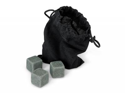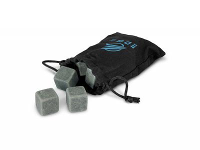 These sets of six whiskey stones are presented in a black cotton and custom printed drawstring pouch. The ice rocks are manufactured from soapstone and are a reusable alternative to ice cubes, chilling a beverage without diluting it. Simply keep them in the freezer and use as required.