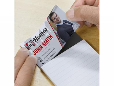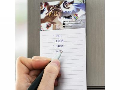 Affordable magnetic note pads which have 25 leaves on lined 70gsm paper with a magnetic holder that attaches to a fridge. The magnetic holder has a self-adhesive top section and a standard 90mm x 50mm business card can be easily attached to it to produce a highly effective DIY promotional product.