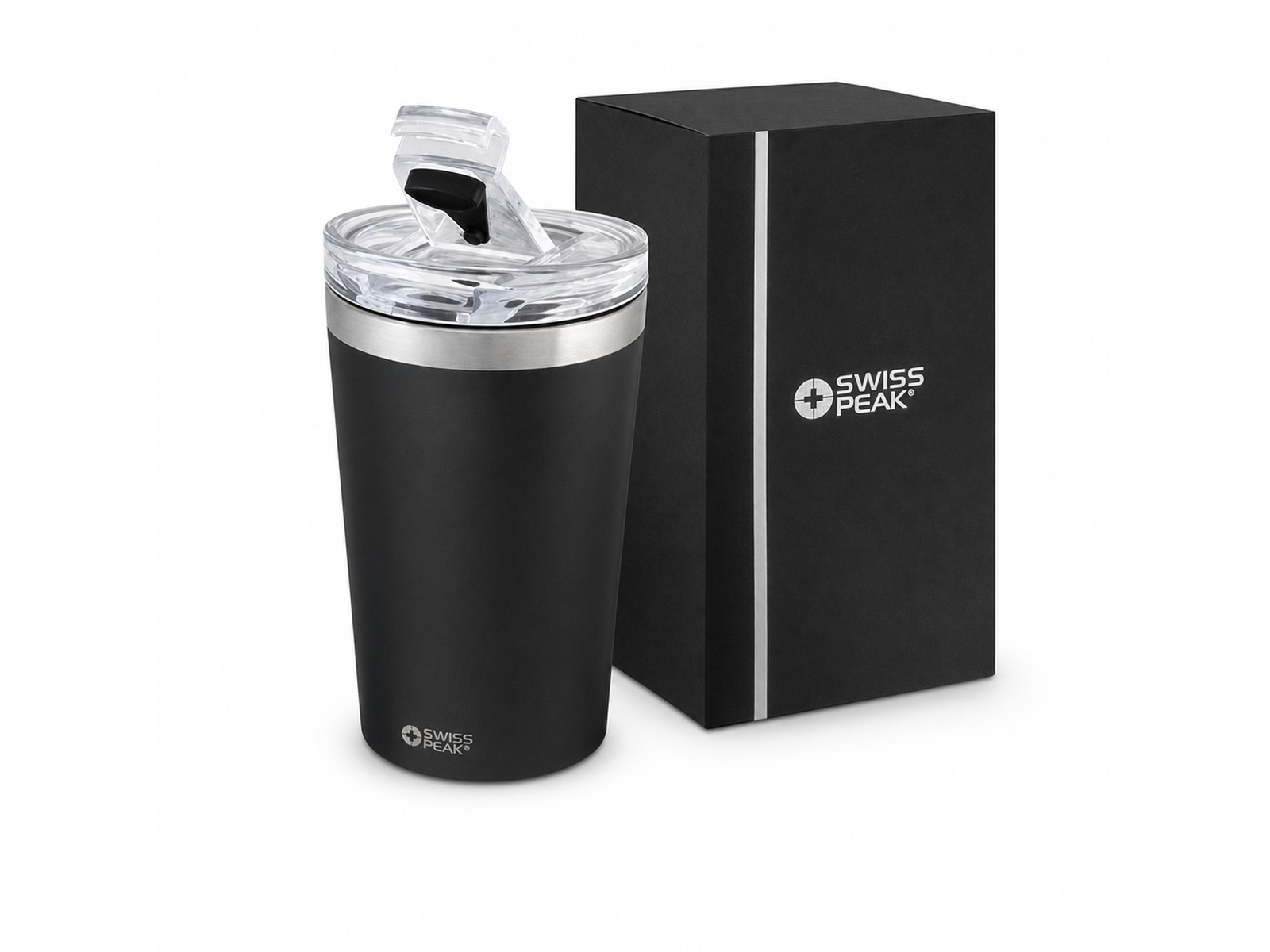 The timeless Swiss Peak design is very evident in these smart & custom branded vacuum cups! They feature a tough powder coating as well as a double wall vacuum insulation which will keep drinks hot or cold for longer. These BPA-free travel mugs come with a secure screw on transparent Tritan lid with a leak resistant flip closure that locks open when in use. Additionally, they come beautifully presented in a Swiss Peak gift box with an information leaflet included.