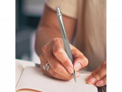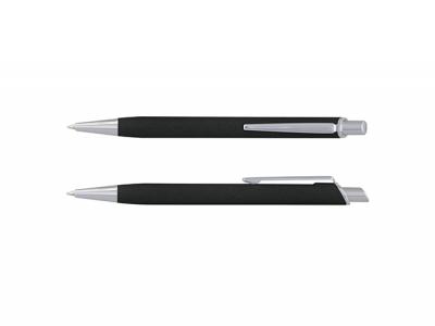 These custom branded retractable aluminium ball pens feature a unique stone-like textured finish and shiny chrome accents. They have a blue large volume refill with 1800 metres of writing ink and a tungsten carbide ball for improved writing quality.