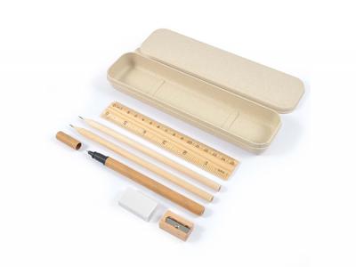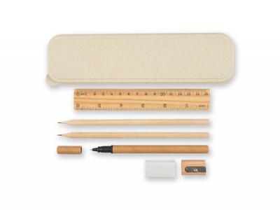 Materials: Case - 50% wheat fibre, 50% PP, wooden pencils, ruler and sharpener, cardboard barrel pen