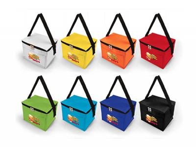 These custom branded cooler bags are made from 210D/PVC material and feature an aluminium foil lined insulation. They can hold up to six standard sized cans or snacks and lunch when you are out and about. Further features include: a double zip top closure, a single 30mm wide black webbing handle (not adjustable, attached to the ends with strong stitching) and a convenient front slip pocket.