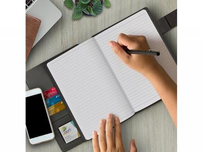 These smart medium-sized compendiums are manufactured from stylish PU and come with a notebook with 60 leaves (120 pages) of lined white paper. The front cover has two slip pockets one of which will hold most smartphones. Other features include a magnetic closure, a large internal slip pocket, four card sleeves including a card window and a pen can be kept in the spine.