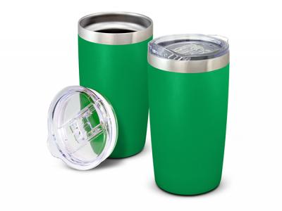 These custom branded 600ml double wall, vacuum insulated stainless steel cups come with a tough powder coating. These promotional BPA-free cups have a secure push on transparent lid with a sliding closure.