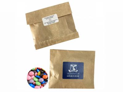 Incorporate branded eco kraft paper bags filled with choc beans (50g) in your next promotional campaign