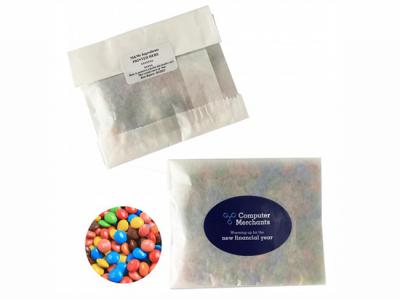 We can have your logo branded on these corporate Eco Kraft Paper Bags Filled With M&Ms (50g) in Full Colour Digital Print. A setup fee of NZ$219.00 will apply to make the film.