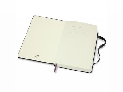 The classic A5 hard cover is made from ivory-colored paper with rounded edges, and includes thoughtful details like a bookmark ribbon and an elastic closure for added privacy. An expandable back pocket offers storage for notes and features the history of Moleskine, along with three pages of adhesive flags for marking important dates and events.