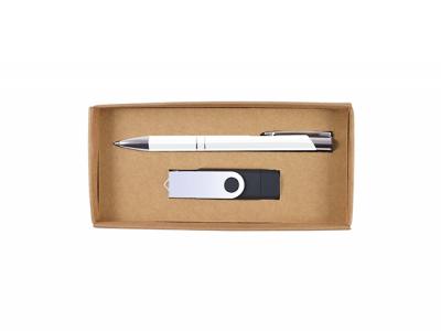 The ideal promotional gift for your staff members and customers as these sets offer multiple branding and personalisation options: Your artwork will be printed or engraved onto these aluminium barrel ballpoint pens (Matte finish, Silver accents, Writing distance: 2.1 kilometres, TC roller ball, Nero pigment ink) as well as onto the 8GB swivel flash drive (USB A connector and Type C connector, Type C has a removable protective cap, USB 2.0 chips, Transfer speed 480 Mbps). Furthermore the gift box itself can also be branded with your company's details and message.