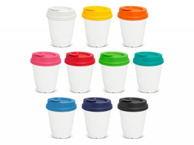 Designed to reduce waste caused by single-use cups and lids, these promotional coffee cups are manufactured from BPA-free polypropylene and feature ergonomic fins around the cup to disperse heat, allowing the custom cup to be carried comfortably on the go. Their secure lid is manufactured from BPA-free polyethylene and sports a smart rotating sipper plug to ensure there are no leaks or spills.