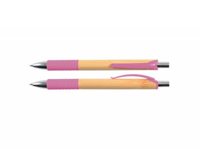 These push button ballpoint pens come with black ink and feature an eco bamboo barrel with chrome button and tip. The highlights are their matching coloured clips and grips.