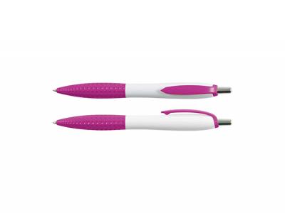 These push button ballpoint pens come with black ink and feature a white barrel with chrome button. The highlights are their matching coloured clips and dimple grips.