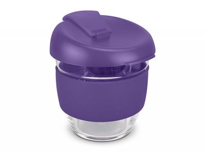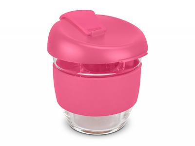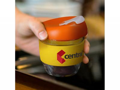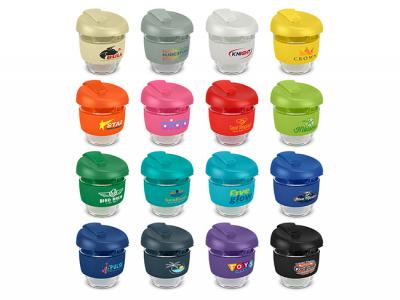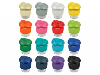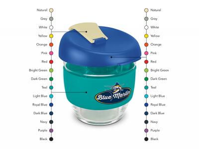 These custom branded 250ml reusable glass coffee cups come with a secure push on plastic lid with silicone seal and a wide heat-resistant silicone band. The lid and band can be mixed and matched in any colour combination from the standard colours at no extra cost. Up to five different colour combinations are included in the price and more are available for an additional charge.
