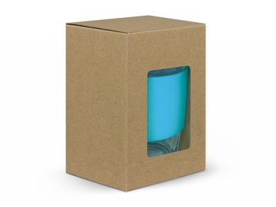 These custom cups are presented in an unbleached cardboard gift box with a window to show the branding. Product care instructions are also printed on one side of them.
