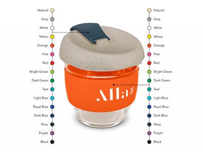 These design inspired 250ml reusable coffee cups have an incredible story to tell: They are manufactured from borosilicate glass and have a heat-resistant silicone band. They also feature a secure push on natural lid which is manufactured from a 50/50 blend of natural rice husk fibre and BPA-free polypropylene and has a silicone seal. The flip closure and band can be mixed and matched in any colour combination from the standard colours at no extra cost. Up to five different colour combinations are included in the price and more are available for an additional charge.