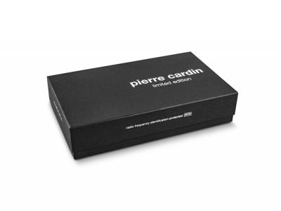 The Pierre Cardin logo is placed on the front of the wallet and on the metal buckle of the belt.